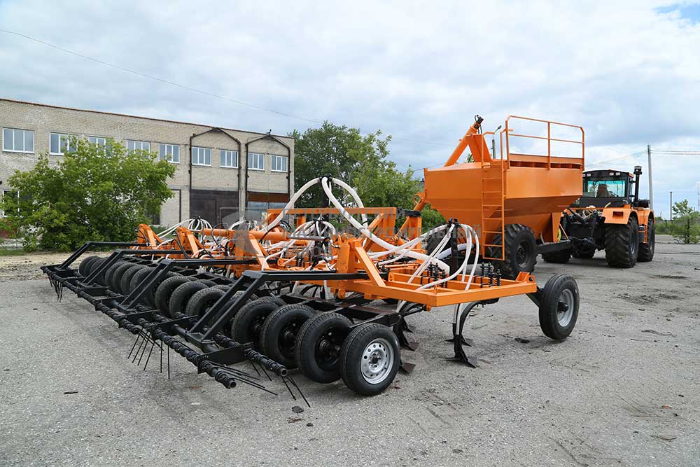 Основные составные части посевного комплекса: рама, бункер для семян и удобрений с катушкой-дозатором и вентилятором пневматической системы, рама, передние опорные колеса, стрельчатые лапы-сошники, балансирные опорно-прикатывающие устройства с колесами, пружинная борона, пневматическая система высева семян и удобрений, загрузочный шнек, система контроля высева.