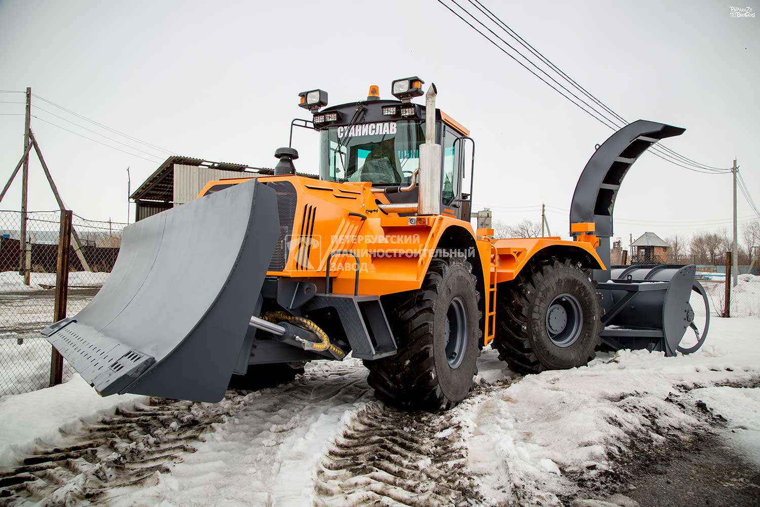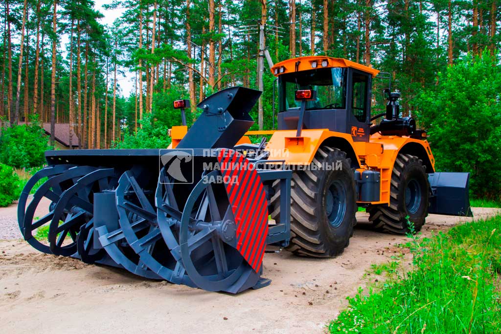 Фрезы, разрабатывающие снежную массу и ротор, выбрасывающий снег через патрубок, смонтированы в общем корпусе, размещенном на задней (грузовой) полураме снегоочистителя. Изменение угла бросания и направления снежной струи вправо и влево производится с помощью поворотного кожуха ротора. В комплекте желоб для загрузки снега в кузов (опционально). |